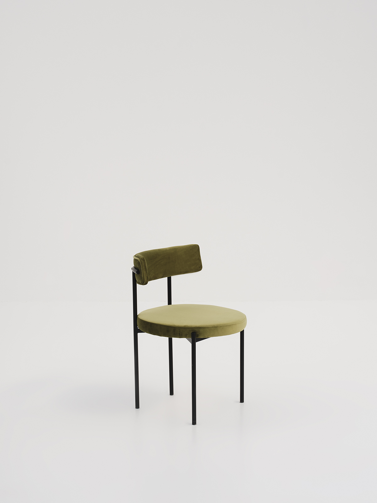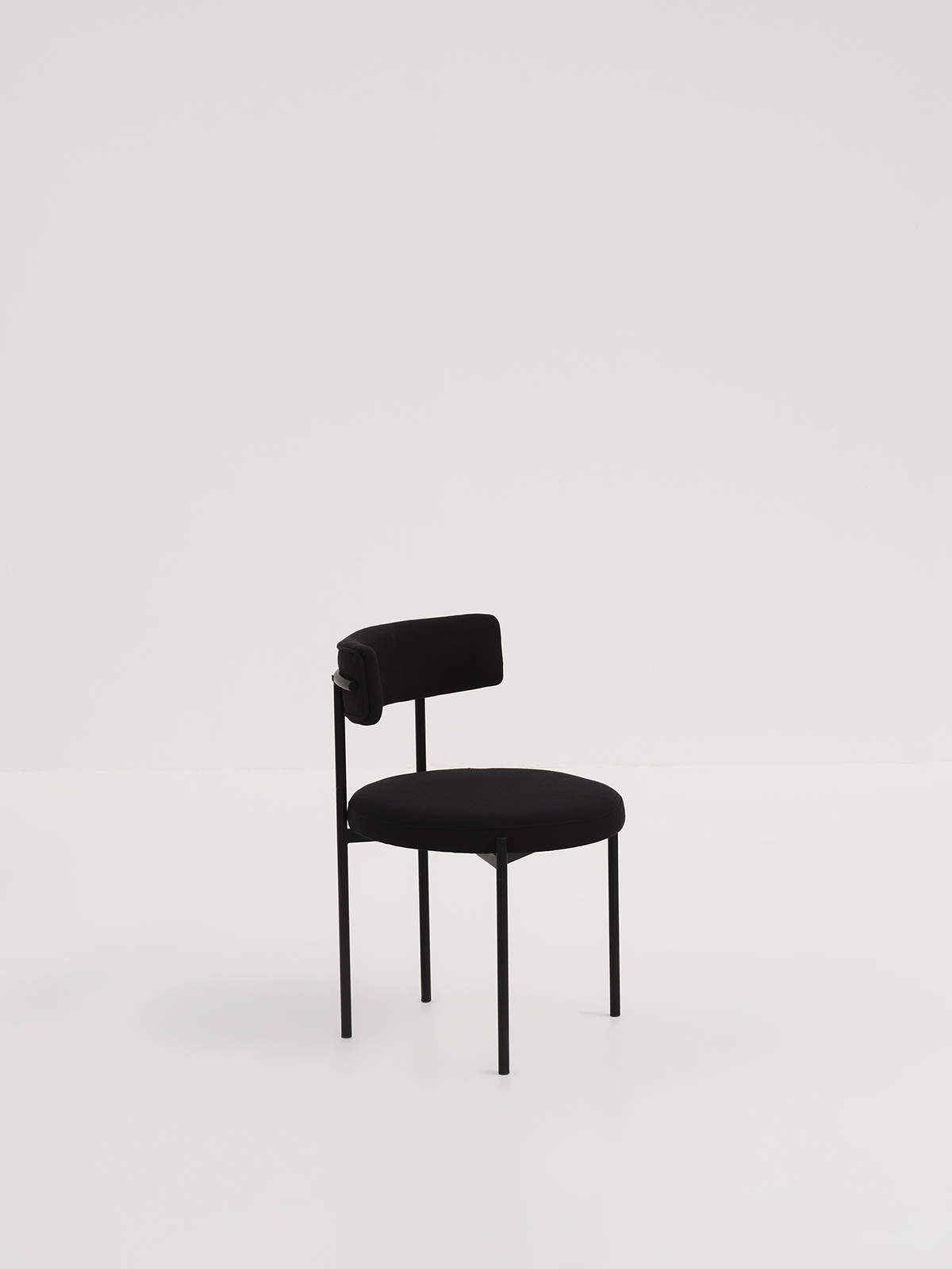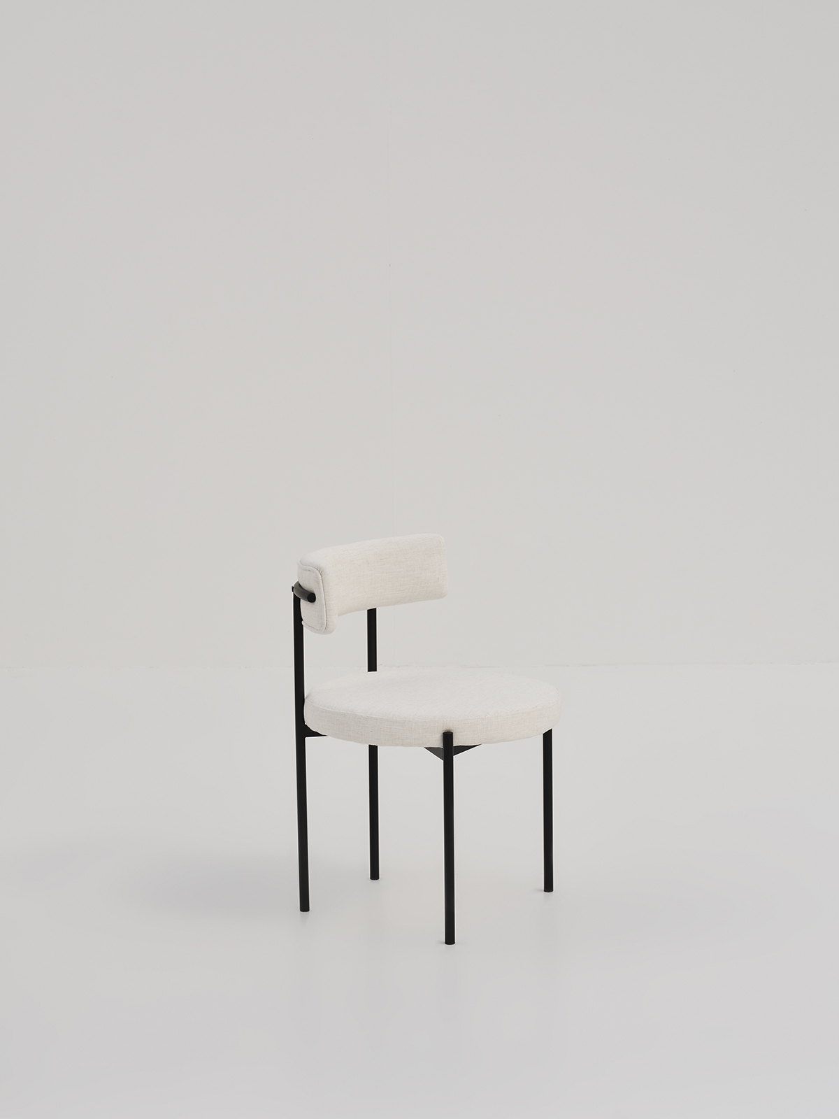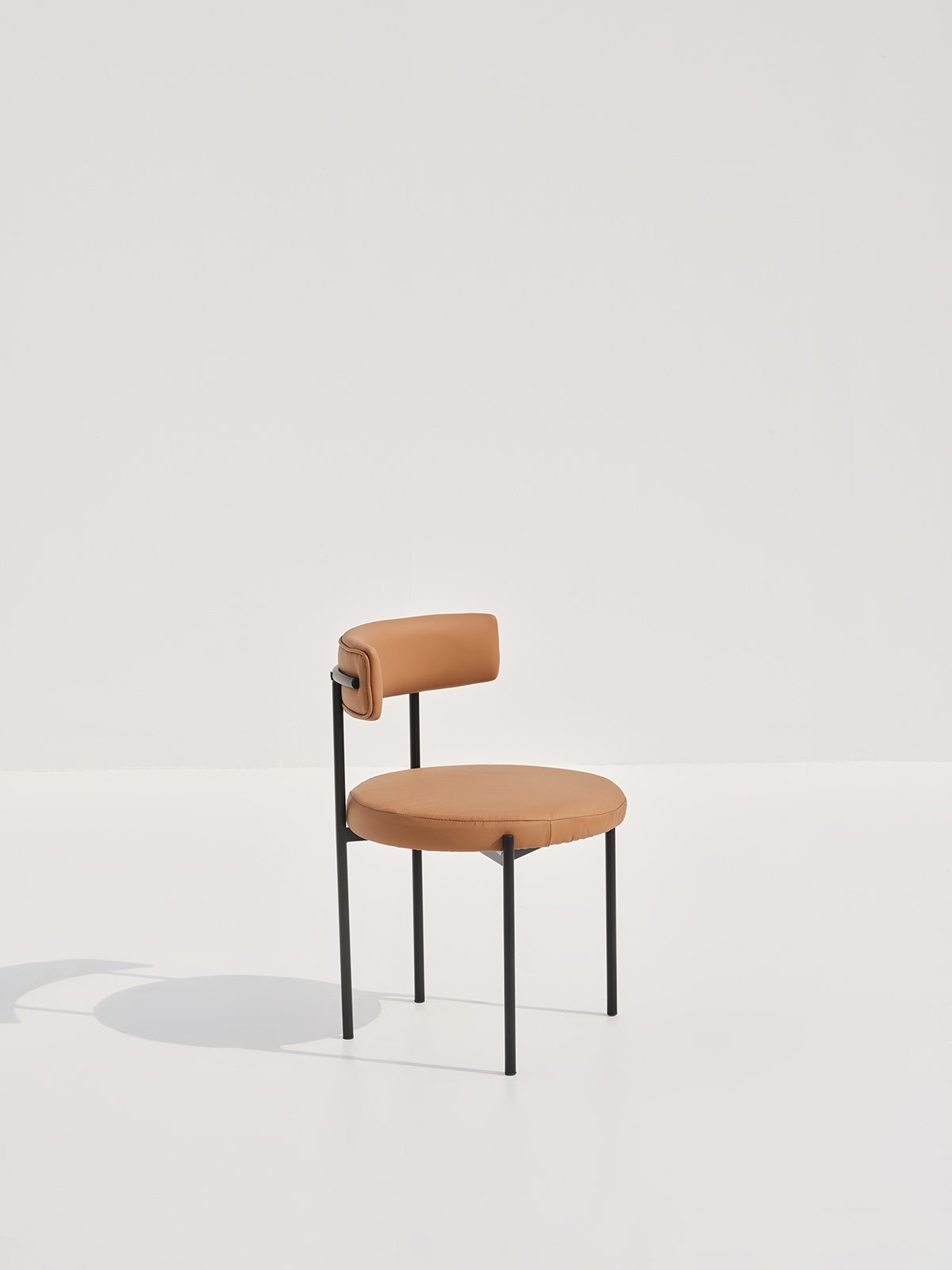 A contemporary dining chair with a curved backrest and a circular seat supported by a black metal frame.
