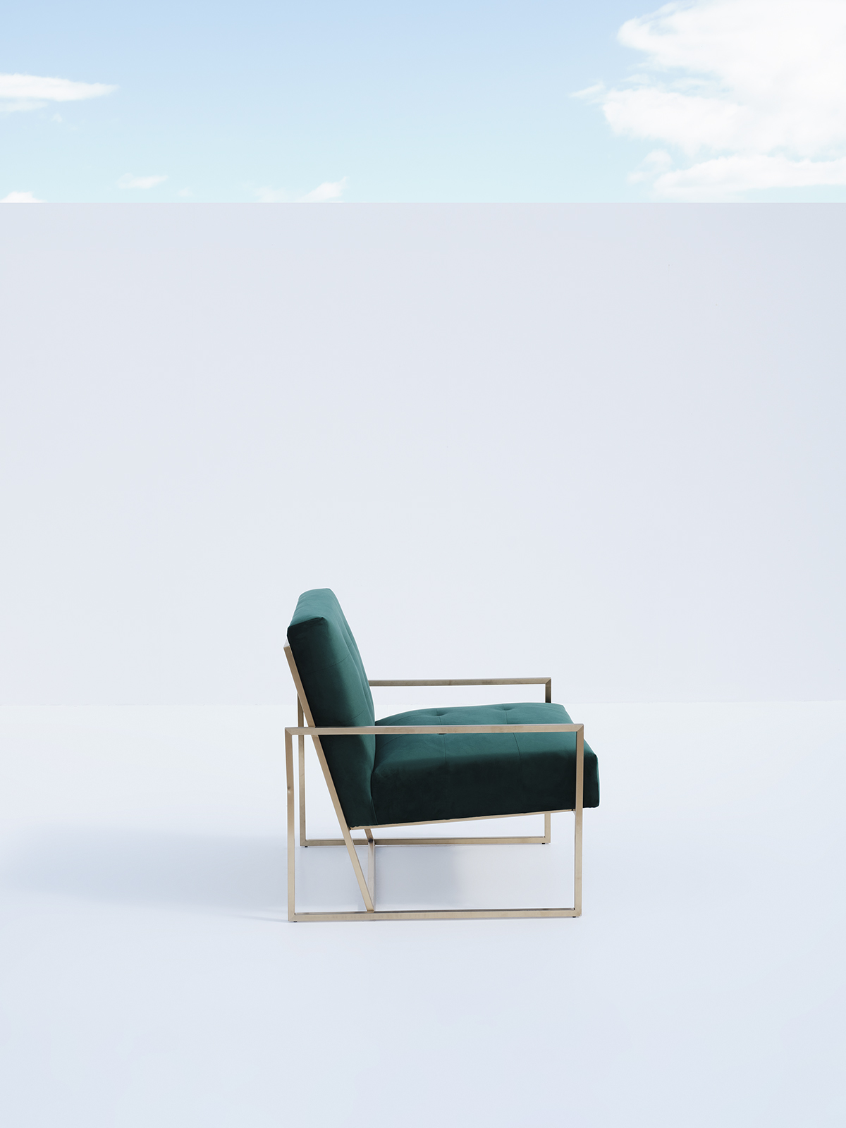 A sophisticated armchair featuring a tufted square silhouette in forest green velvet set within a geometric gold metal frame.