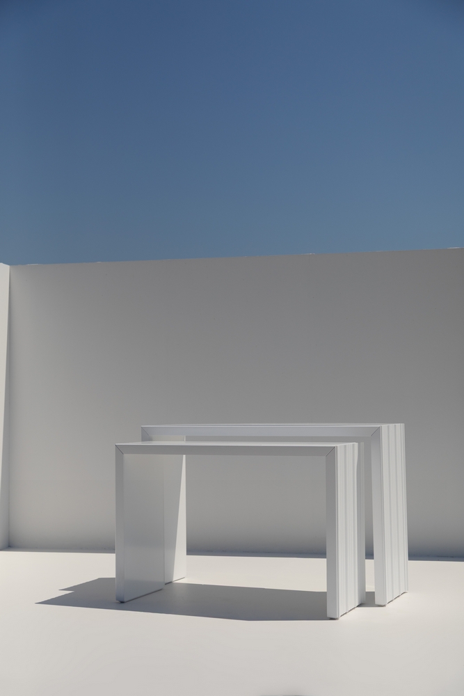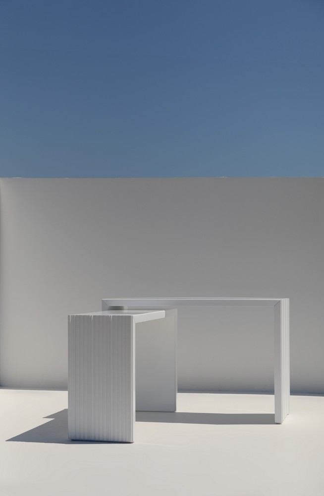 Console table set with linear textured detail on the legs. Finished in matte white. Available in two sizes.