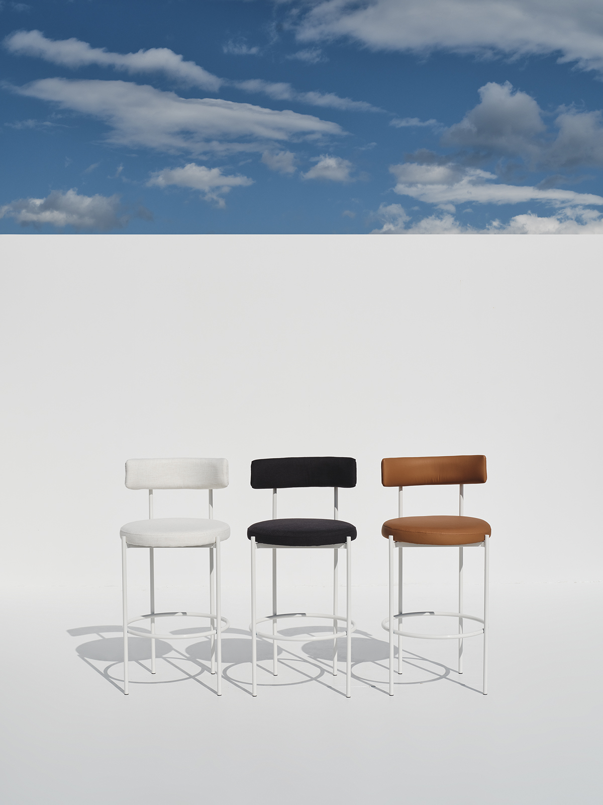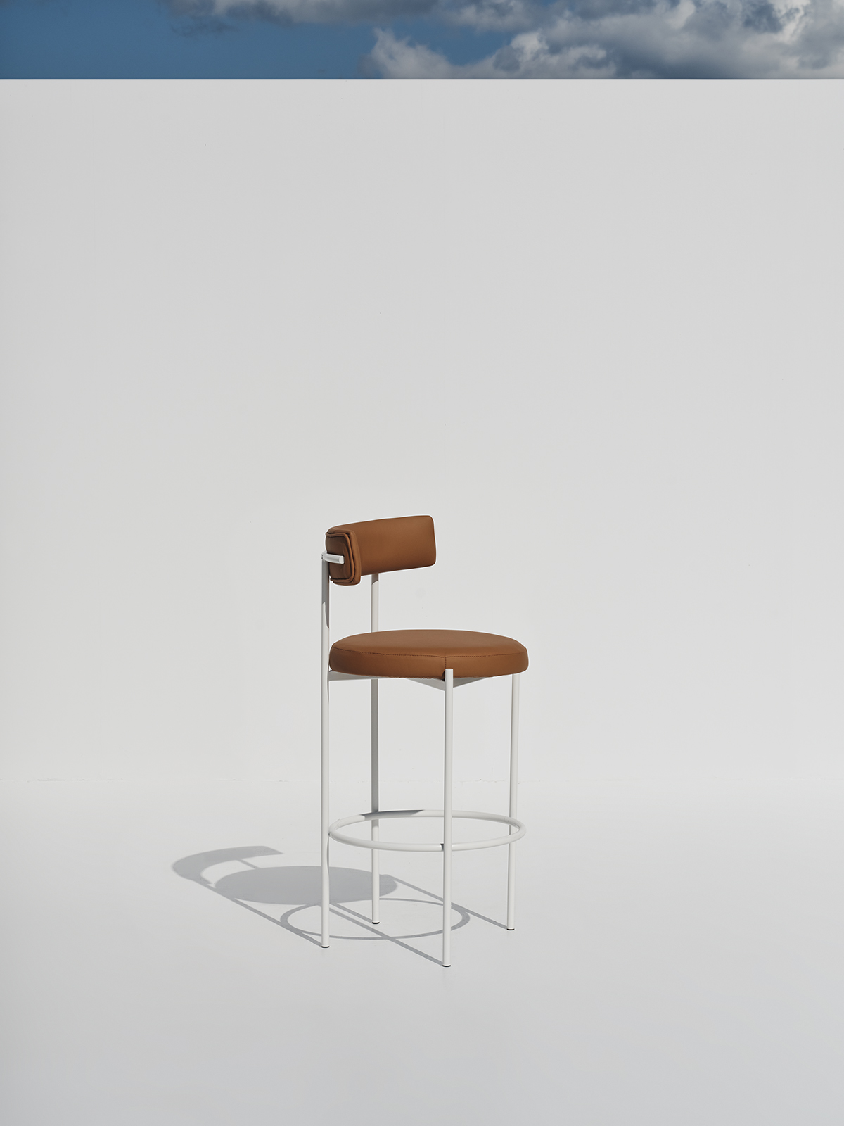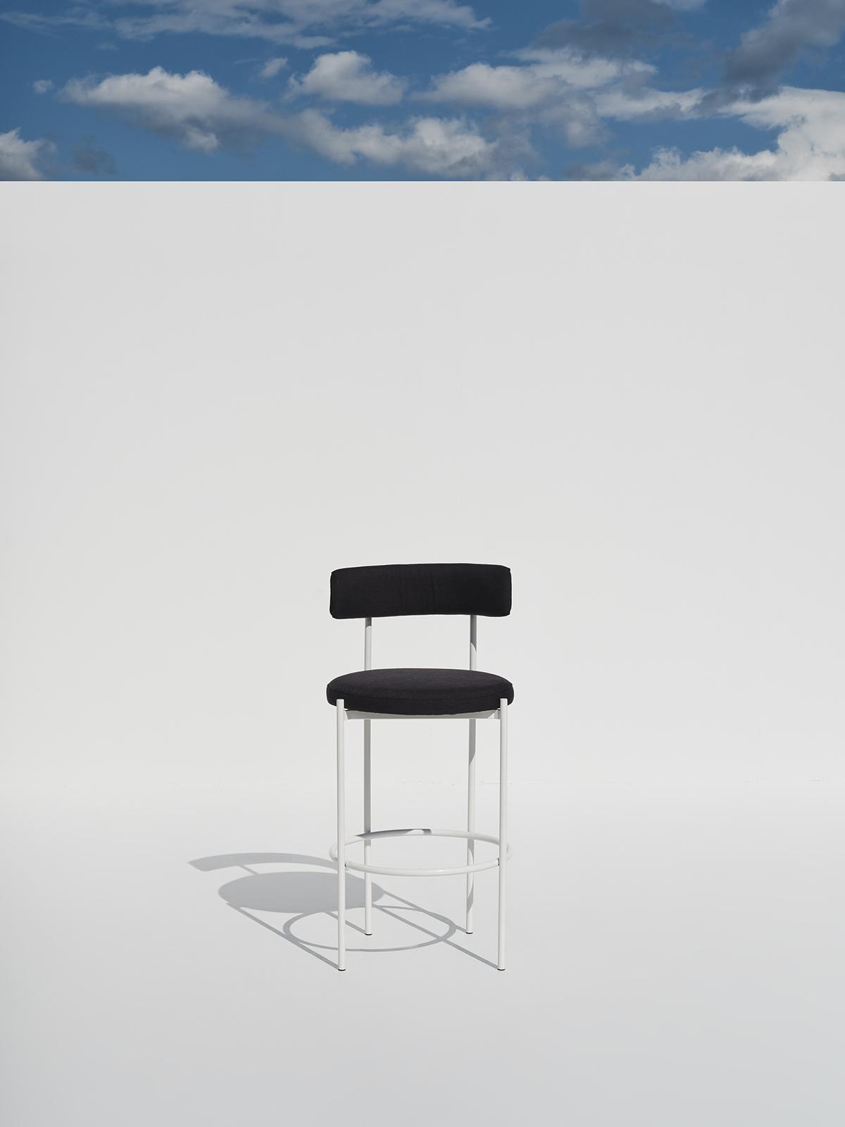 An elegant high-seat chair defined by its minimal silhouette, pairing a soft-touch upholstered back and cushion with a clean, linear metal base.