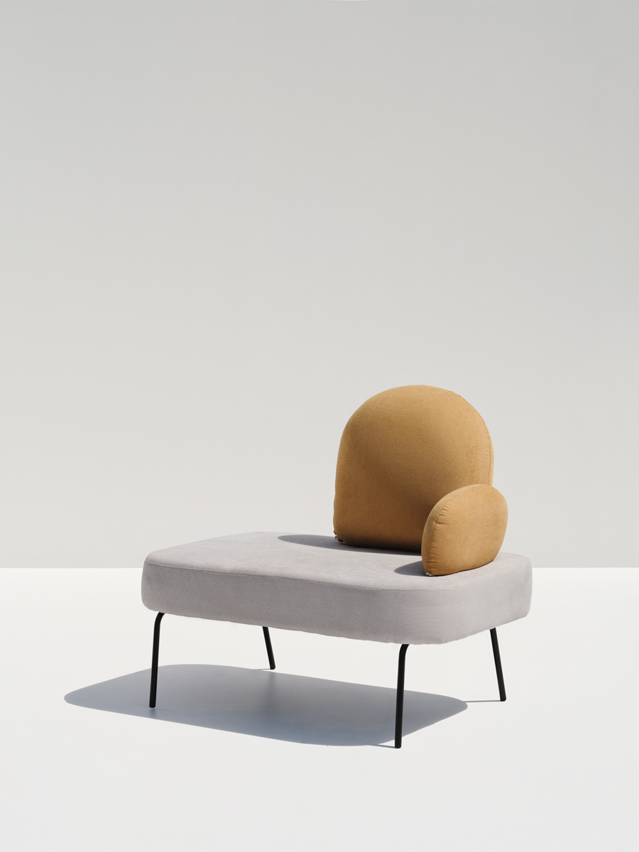 Bench with grey seat, mustard yellow backrest and side cushion. Black metal legs.