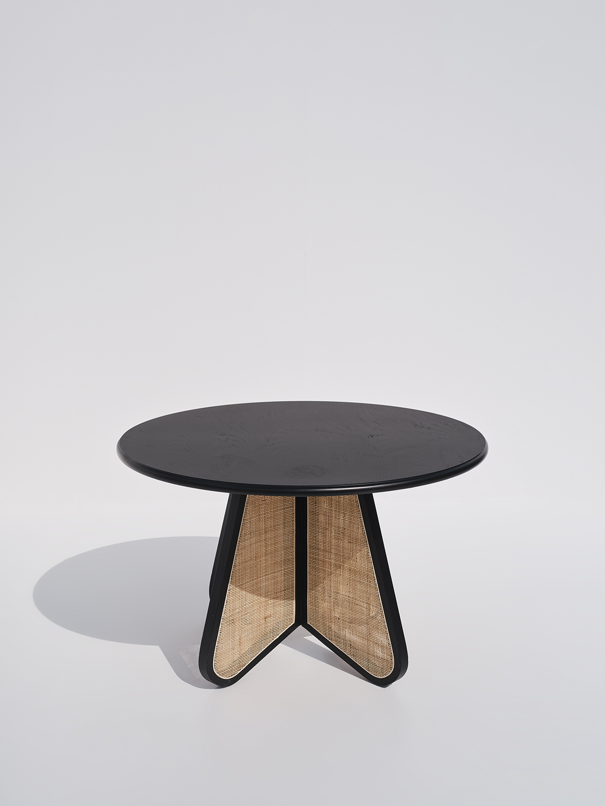 Wooden round dining table in black with a natural woven cane base, featuring detailed woven panels.