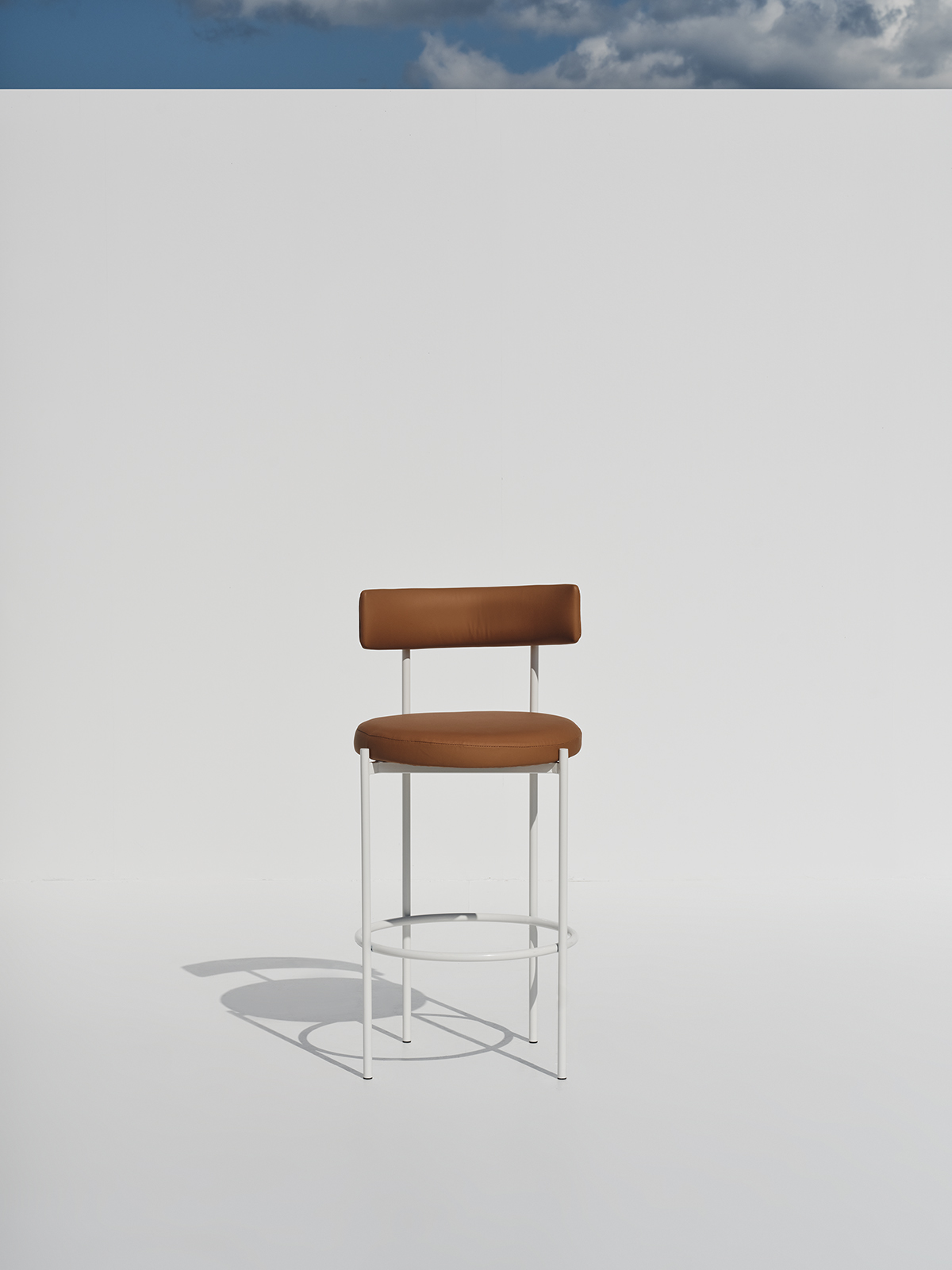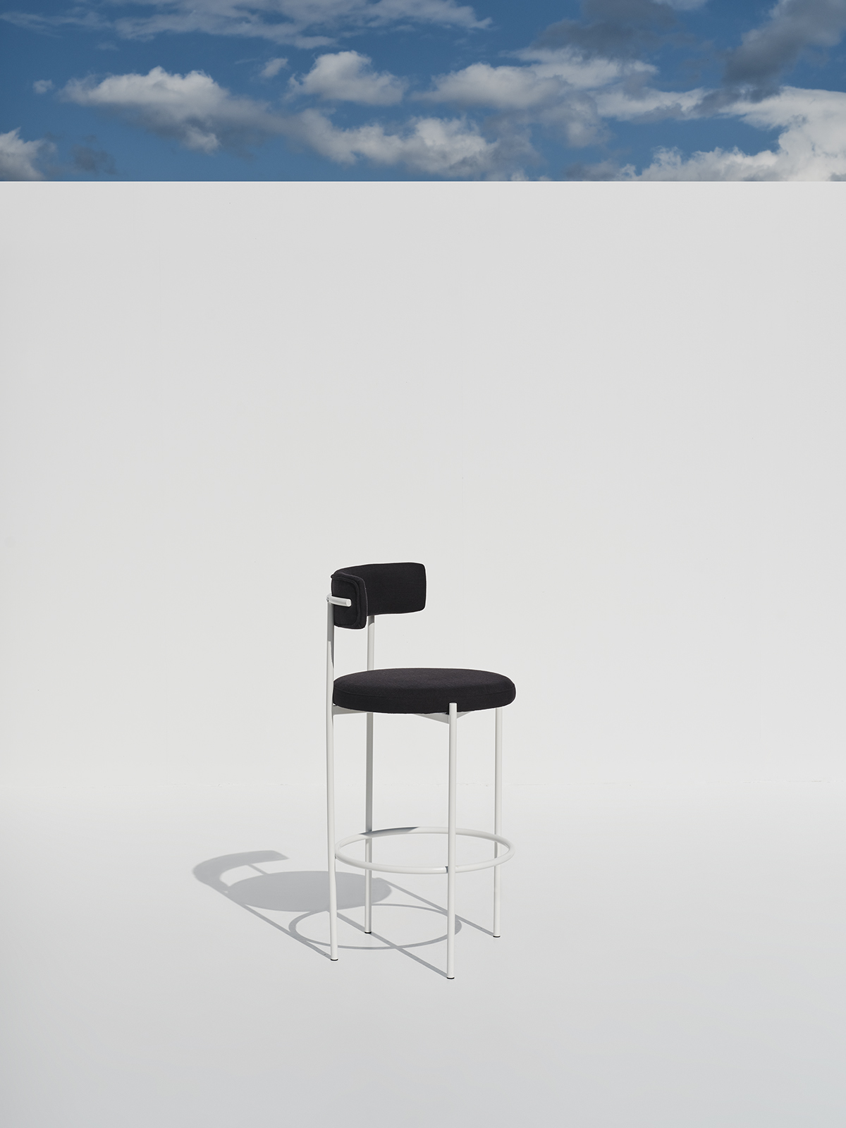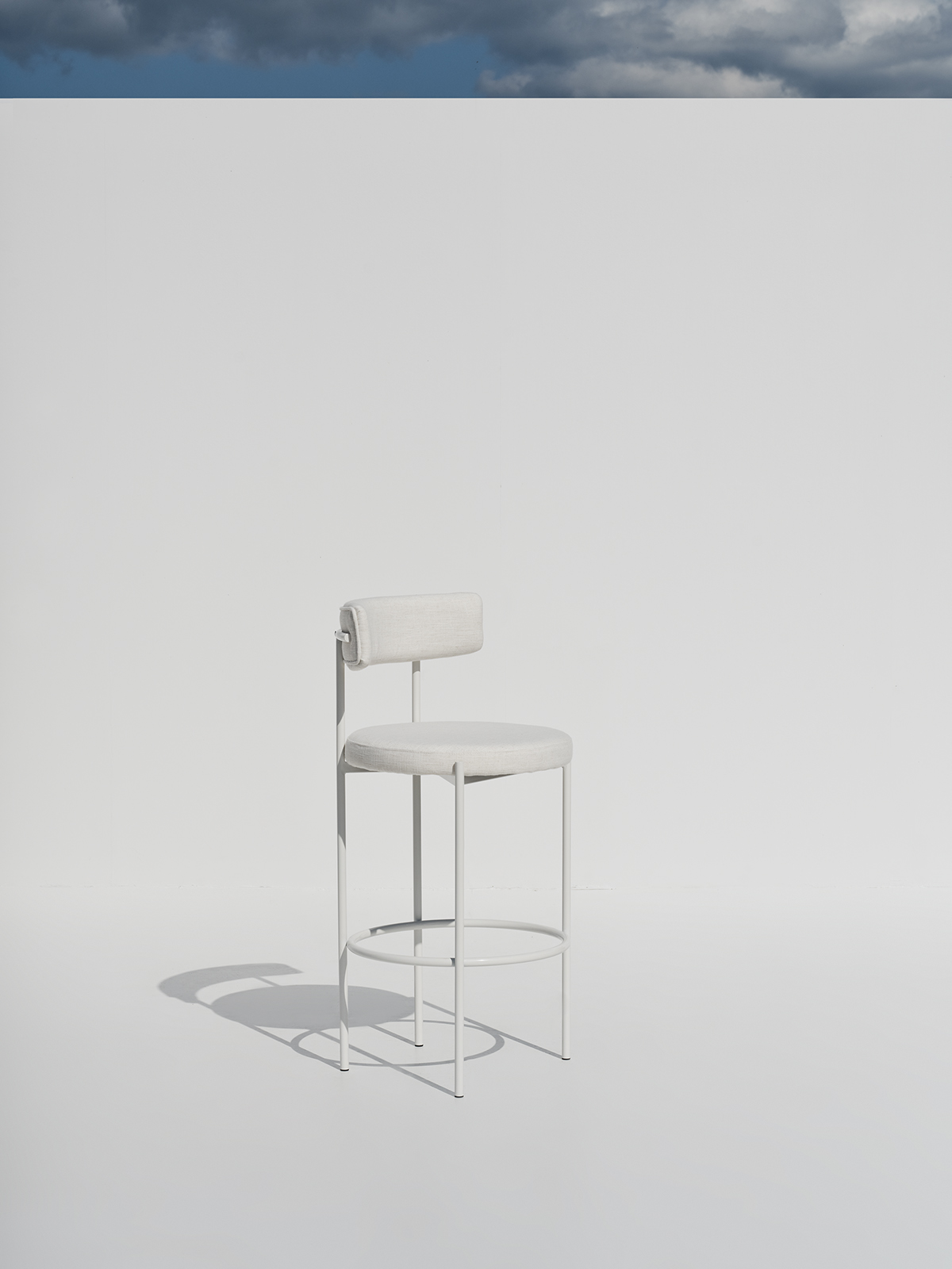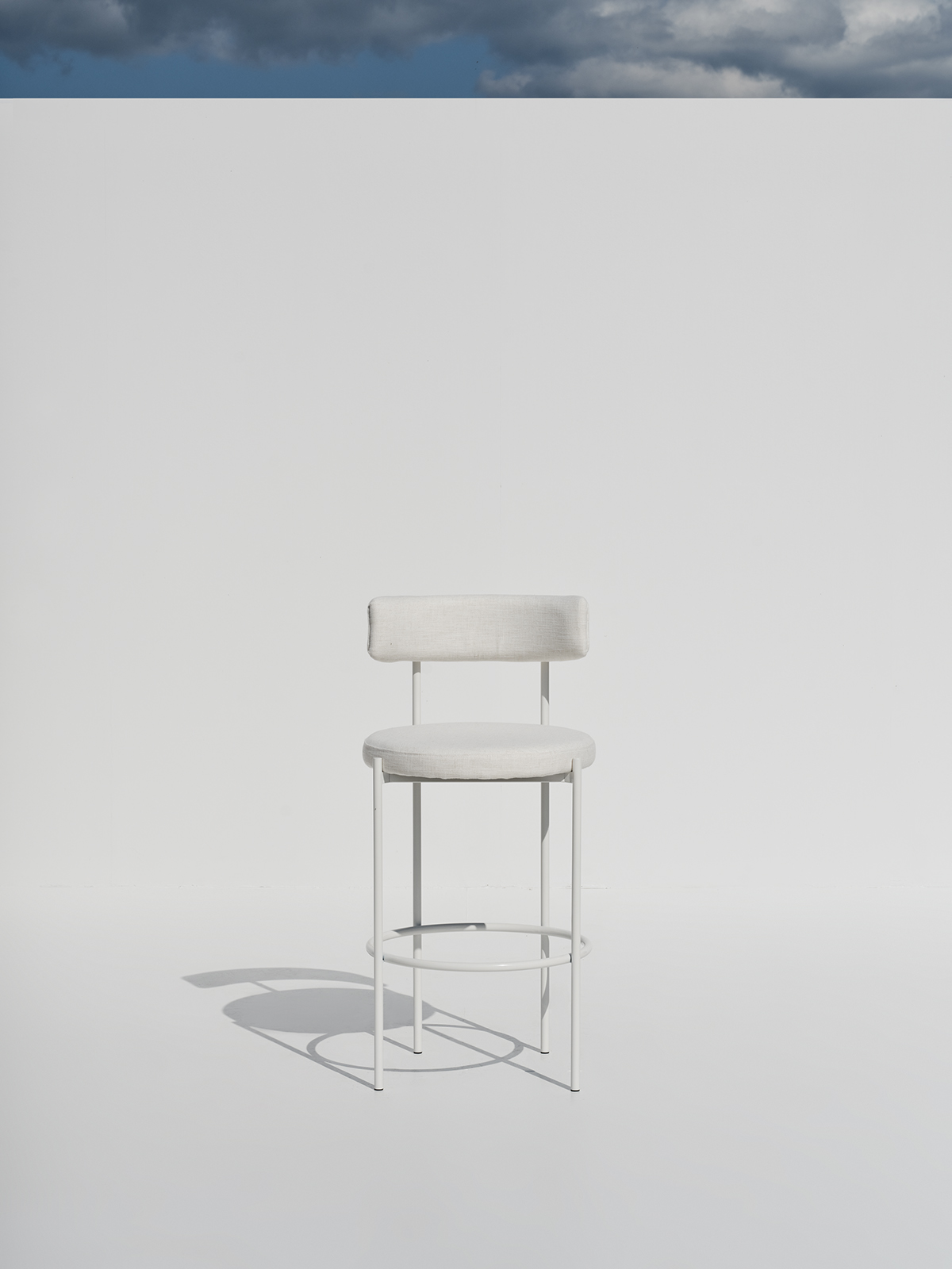 An elegant high-seat chair defined by its minimal silhouette, pairing a soft-touch upholstered back and cushion with a clean, linear metal base.