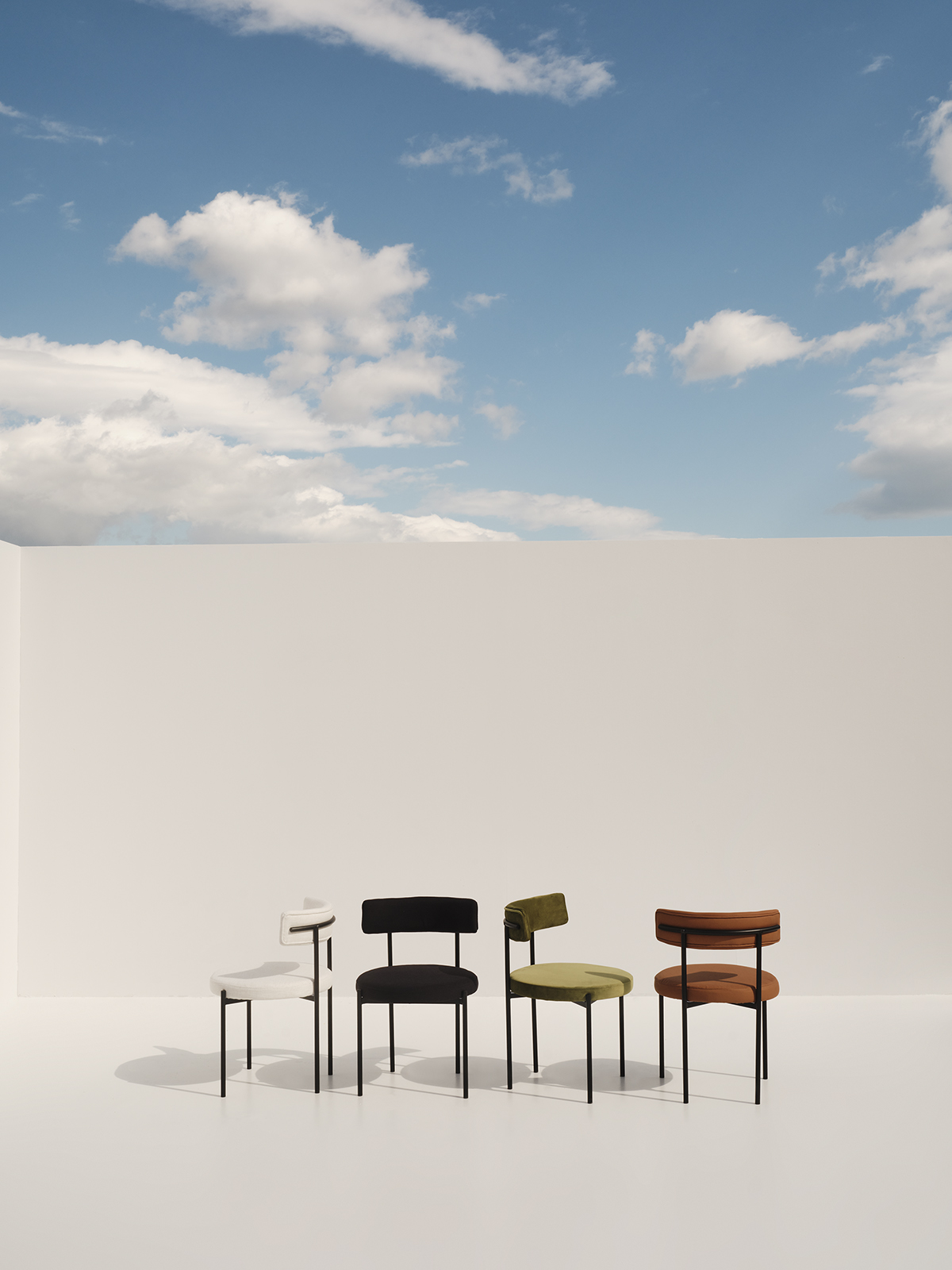 A contemporary dining chair with a curved backrest and a circular seat supported by a black metal frame.