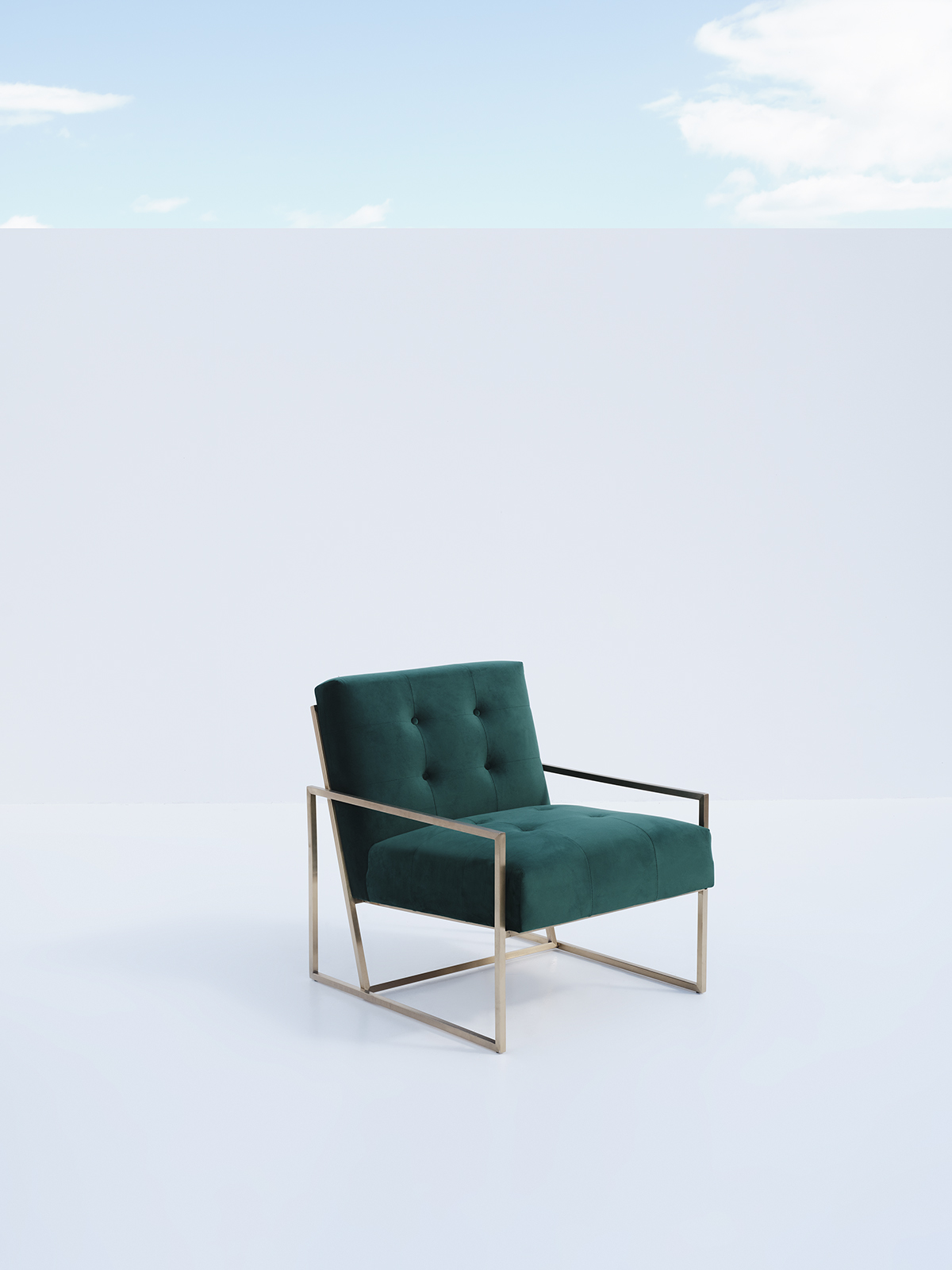 A sophisticated armchair featuring a tufted square silhouette in forest green velvet set within a geometric gold metal frame.