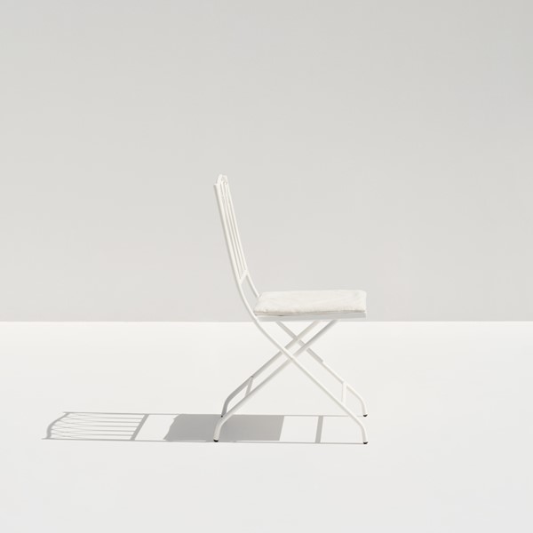 Folding metal chair with geometric backrest detail and soft cushion seat, in matte white.