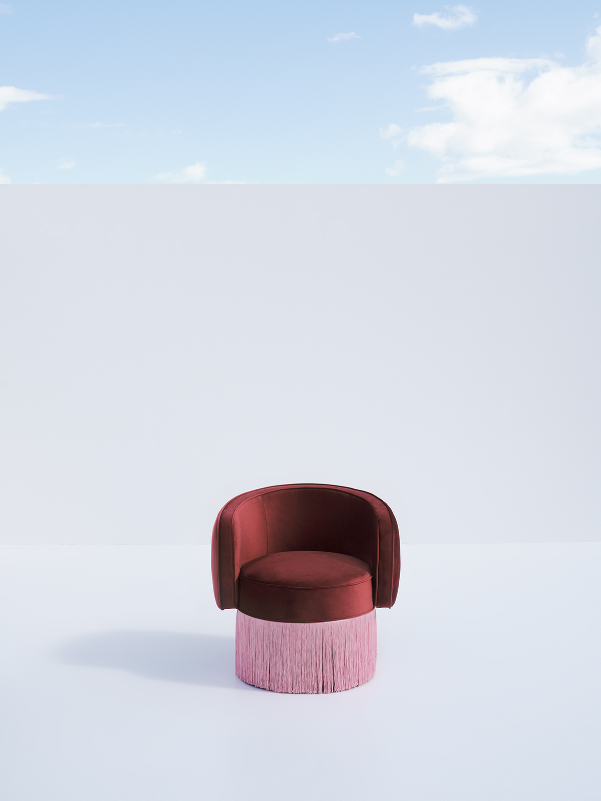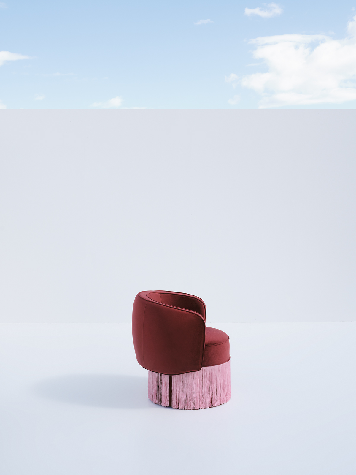 A sculptural statement piece featuring a plush burgundy velvet barrel seat perched atop a vibrant pink cylindrical base with detailed vertical pleating.