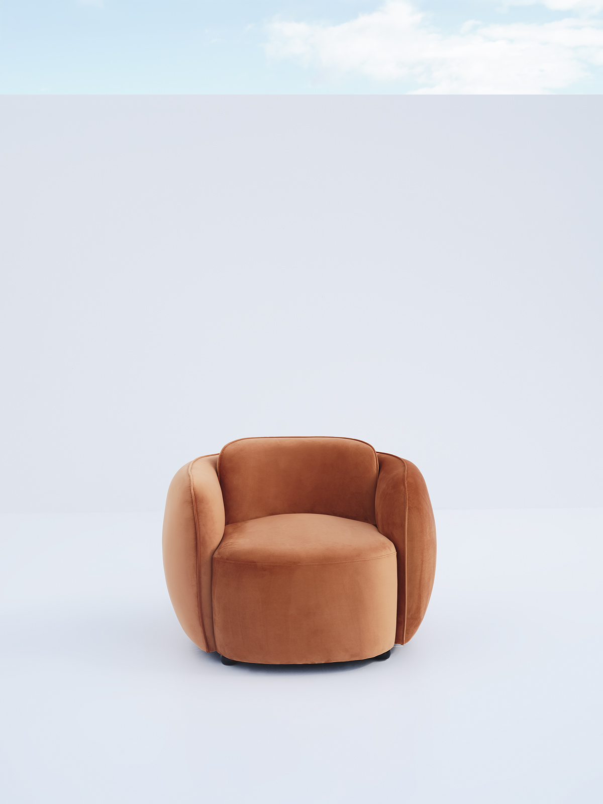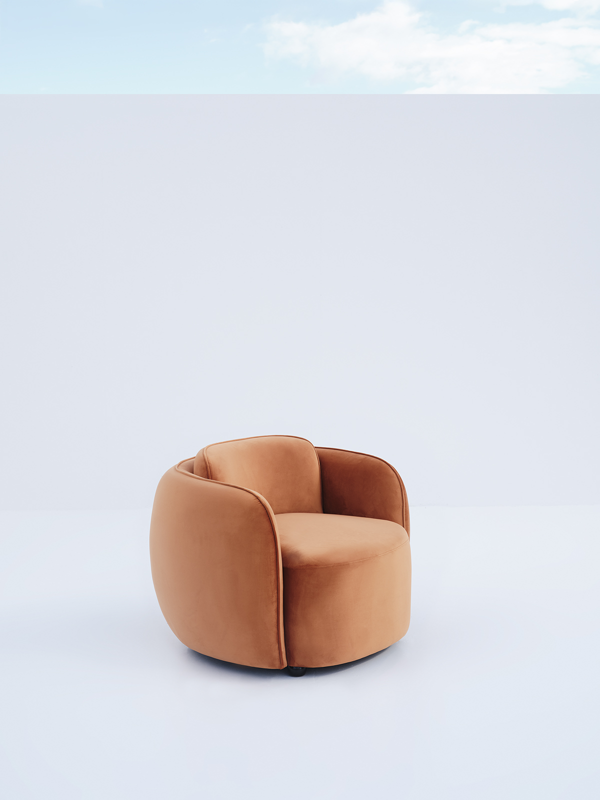 A plush, low-profile swivel armchair featuring a rounded, cocoon-like silhouette upholstered in a burnt orange fabric.