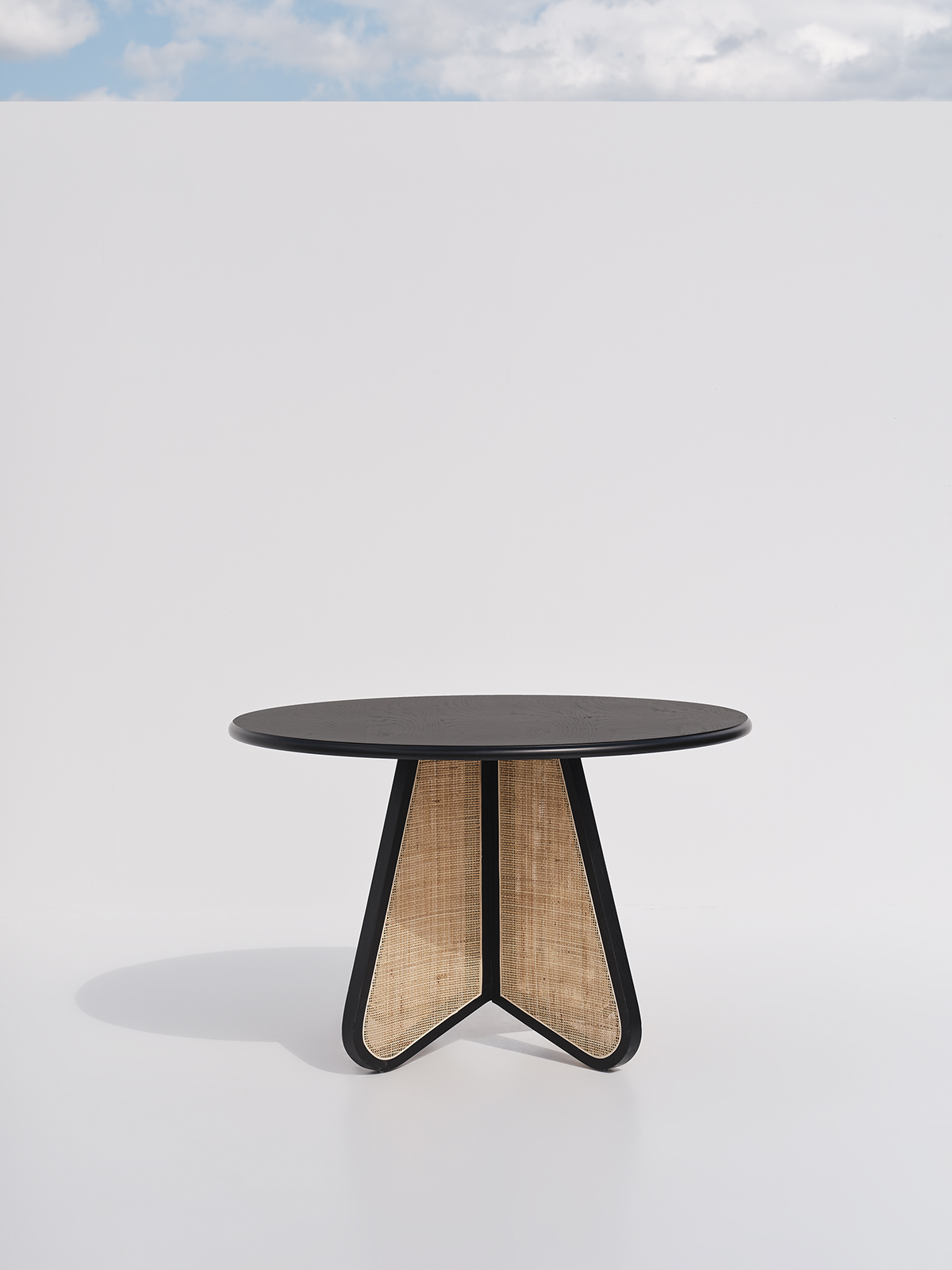 Wooden round dining table in black with a natural woven cane base, featuring detailed woven panels.